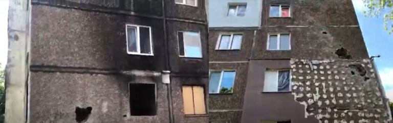 The eyewitness KI-03 testifies that a round hit a house no.138 on Pukhov street at the level of the 7th floor as a result of the attack. However, having compared the panoramic images of the streets and documented materials we can see that it`s the house no. 134 on the level of the 8th floor that was actually hit. This inaccuracy in the witness account is caused by the fact that houses no. 134, 136 and 138 on General Pukhov street are, in fact one house partitioned perpendicularly by the section with a separate entrance.