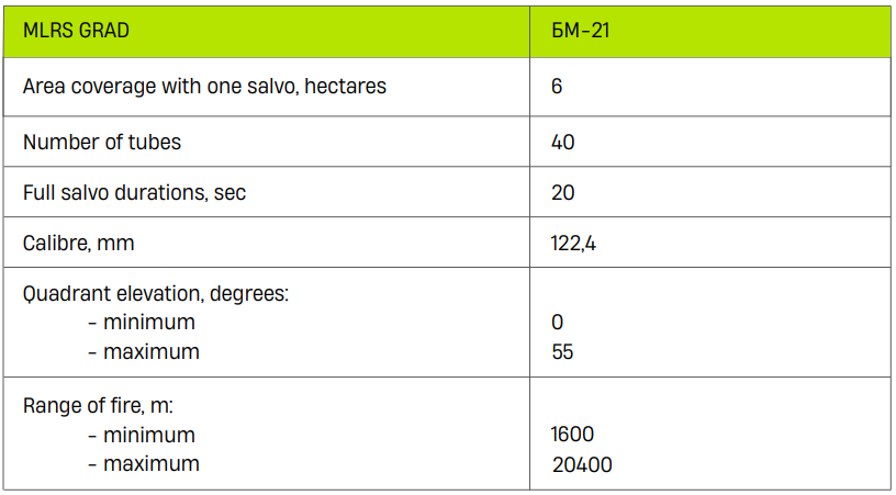 Note: the table lists average figures for the most widely used type of MLRS GRAD round: a high explosive fragmentation round with 9М22 index. As regards other round types, some of them may have the striking range of 40 km.