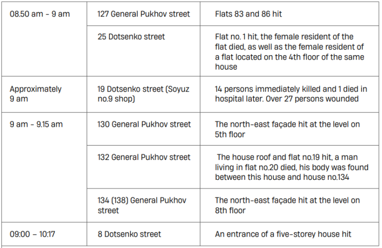 ‣ projectile direct hit aperture in the wall at the level of the 8th floor in the house no. 134 on General Pukhov street, in the wall facing north-east;